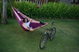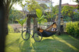 This brand-new innovation could completely transform your next adventure! All you need to set up your favorite hammock horizontally is a single tree or anchor point, your bicycle, and the 2ND TREE set. In no time, the stakes are securely fixed into the ground, serving as anchors. These are then attached to your bicycle in a stable triangular formation, ensuring your setup remains stable and secure. This revolutionary method of hanging your hammock offers maximum flexibility and safety for your adventures.