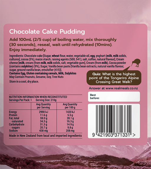 Real MealsDescription Rich, moist, chocolate pudding in a smooth, creamy chocolate sauce. Ingredients Chocolate cake [Sugar, wheat flour, water, vegetable oi...