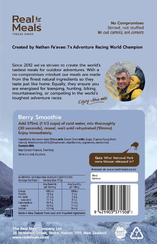 Founded in New Zealand by world champion adventurer Nathan Fa’avae, Real Meals makes chef-crafted, freeze-dried dishes that actually taste like home. Cooked in small batches and then freeze-dried, they retain flavour, nutrition, and pack down to a fraction of their original weight. Designed for hiking, racing, and exploring, these meals deliver lightweight, satisfying fuel for any adventure.
