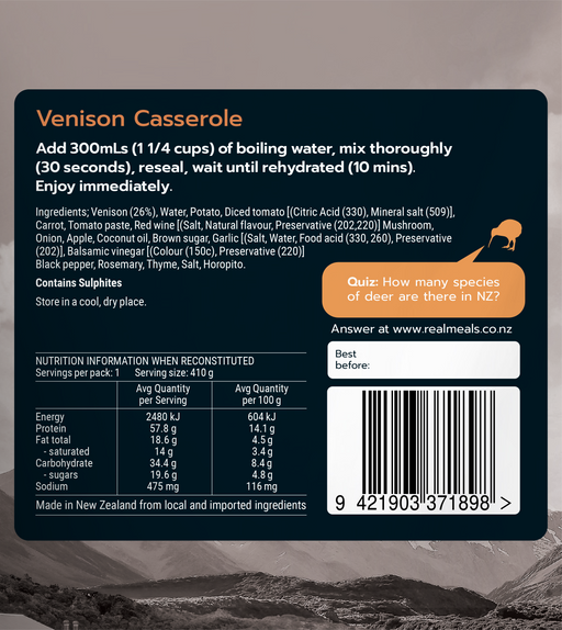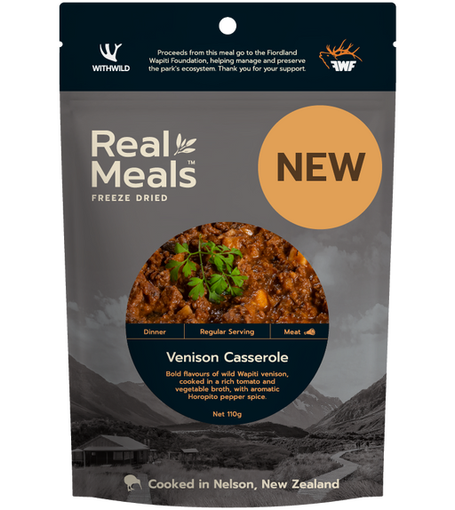 Real MealsDescription Venison Casserole – Wild Wapiti venison, in a rich tomato and vegetable broth with Horopito spice. Next level outdoor dining. Ingredien...